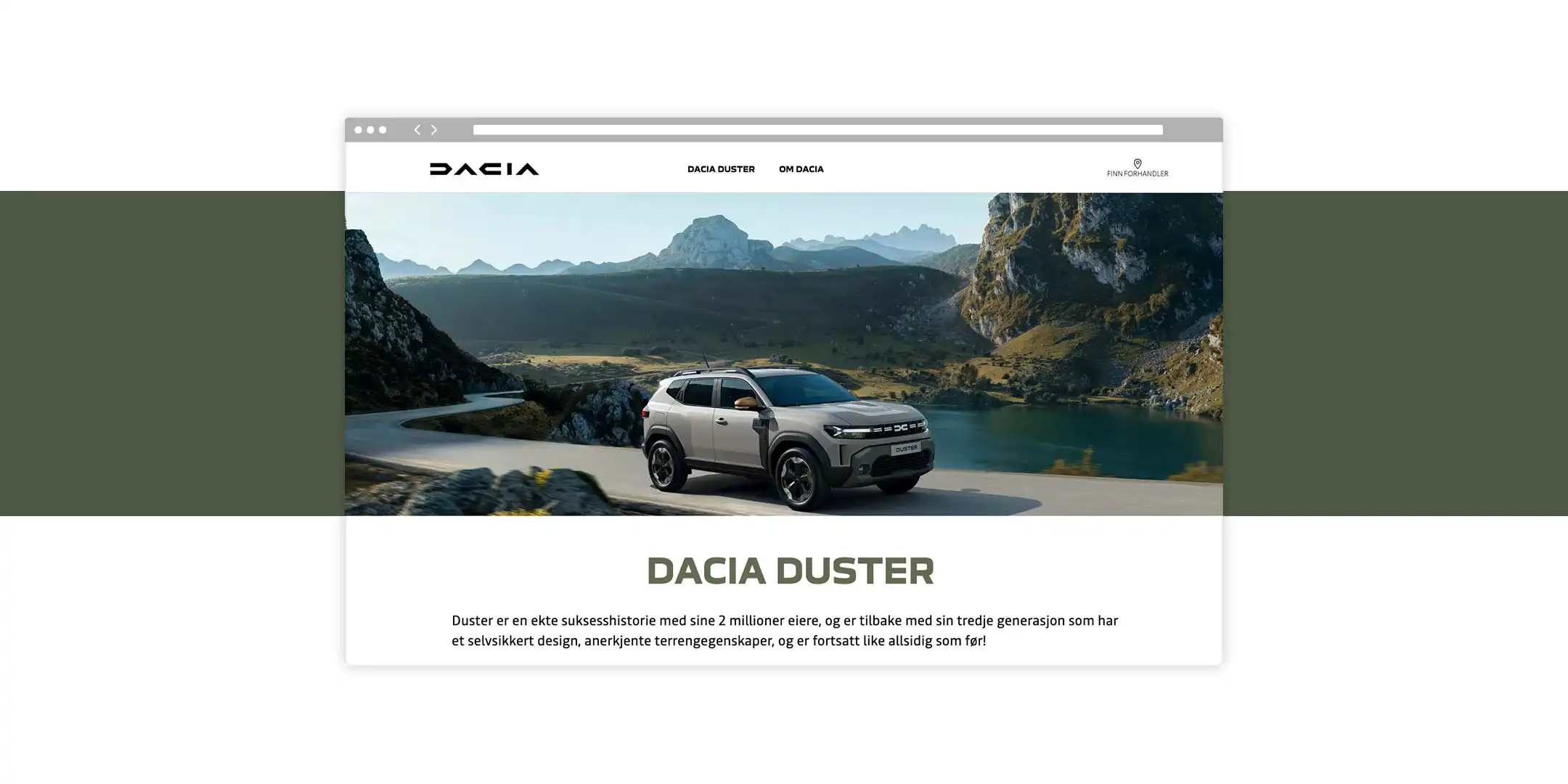Nettsiden ble utviklet for å formidle Dacias identitet på en tydelig og tilgjengelig måte. Struktur og innhold ble tilpasset norske brukere, med fokus på brukervennlighet og effektiv navigasjon. Designet støttet merkevarens filosofi om enkelhet og smart funksjon. Løsningen ble tilrettelagt for god ytelse og tydelig konvertering.